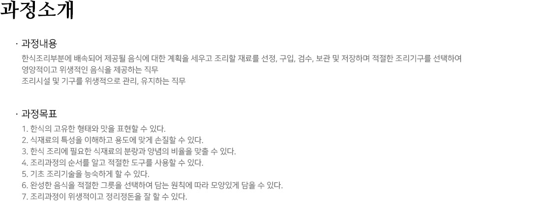 | ÇѽÄÁ¶¸®±â´É»ç ½Ç±â(ÀüÀû,±¸ÀÌ,¼÷äÁ¶¸®) | 5.12 ~ 6.4(8ȸ) | È,¸ñ 14:00~17:00 | 20 | 252,400¿ø |