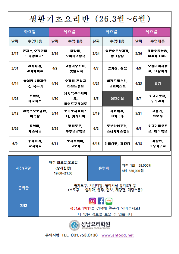 | ÇѽıâÃÊÁ¶¸® ½Ç¹«°úÁ¤ | ¿ù,¼ö 14:00~18:00 | 20 | 354,000¿ø |