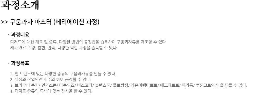 | ±¸¿ò°úÀÚ ¸¶½ºÅÍ (º£¸®¿¡ÀÌ¼Ç °úÁ¤) | 1/12 - 2/2 (¿ù,¼ö,±Ý ¿ÀÈÄ) | 14:30 ~ 17:30 [10ȸ] | 18¸í | 274,000¿ø |