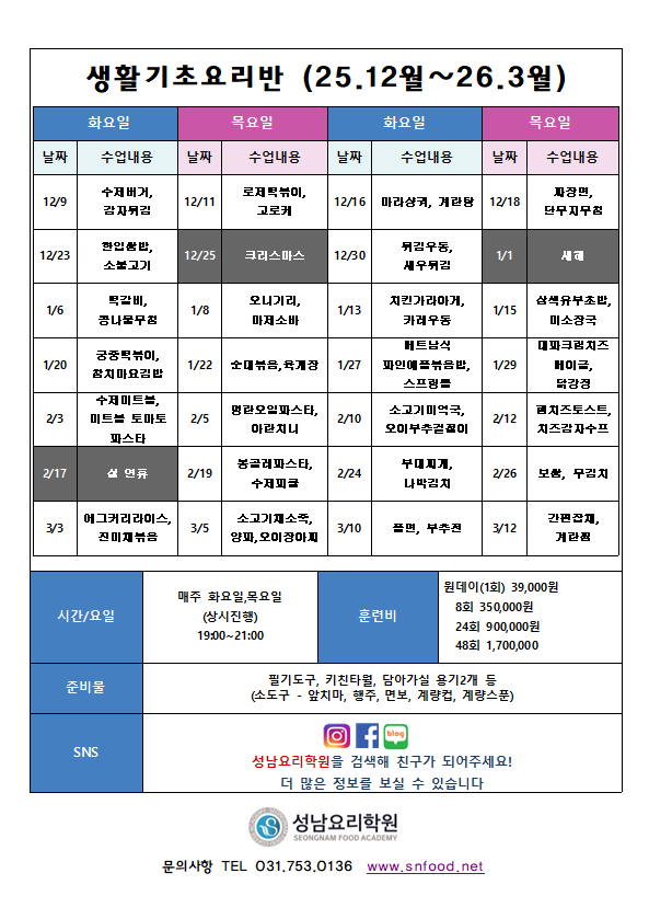 | ¾ç½Ä¿ä¸® ¸¶½ºÅÍ ½Ç±â(È£ÅÚ½Ä ¿¬È¸Á¶¸®) | 3.3 ~ 4.21(15ȸ) | È,¸ñ 19:00~22:00 | 20 | 366,400¿ø |