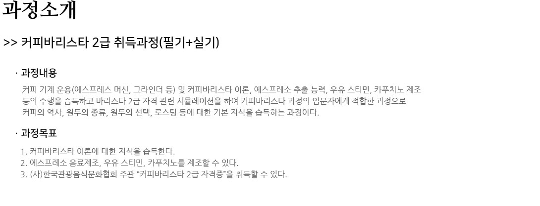 | Ä¿Çǹٸ®½ºÅ¸ 2±Þ Ãëµæ°úÁ¤(½Ç±â) | 6/10 - 7/3 (¿ù,¼ö,±Ý ¿ÀÀü) | 09:30 ~ 13:00 [11ȸ] | 18¸í | 350,300¿ø |
