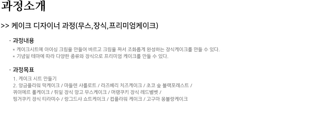 | ÄÉÀÌÅ© µðÀÚÀÌ³Ê °úÁ¤(¹«½º,Àå½Ä,ÇÁ¸®¹Ì¾öÄÉÀÌÅ©) | 2/24 - 4/2(È,¸ñ ¿ÀÀü) | 09:30 ~ 13:00 [11ȸ] | 18¸í | 415,200¿ø |