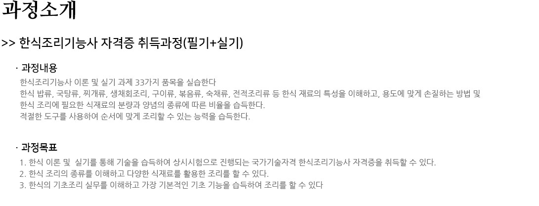 | ÇѽÄÁ¶¸®±â´É»ç Ãëµæ°úÁ¤(½Ç±â) | 5/6 - 6/17 (¿ù,¼ö,±Ý ¿ÀÈÄ) | 14:30 ~ 18:00 [17ȸ] | 18¸í | 526.000¿ø |