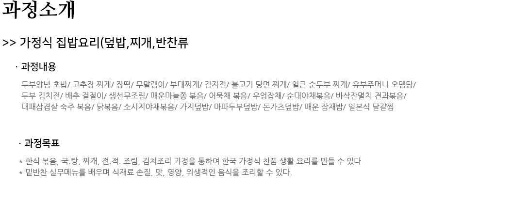 | °¡Á¤½Ä Áý¹ä¿ä¸®(µ¤¹ä,Âî°³,¹ÝÂù·ù) | 12/30 - 26/2/5 (È,¸ñ ¿ÀÀü) | 09:30 ~13:00 [11ȸ] | 18¸í | 366,400¿ø |